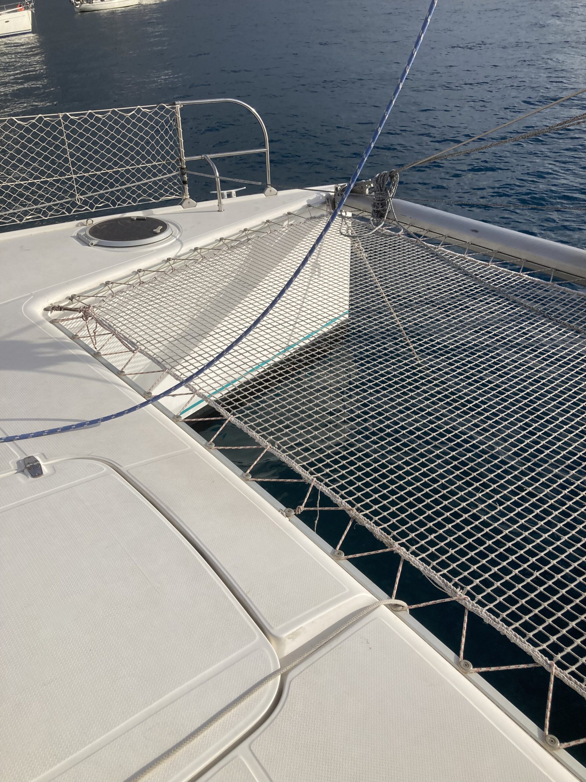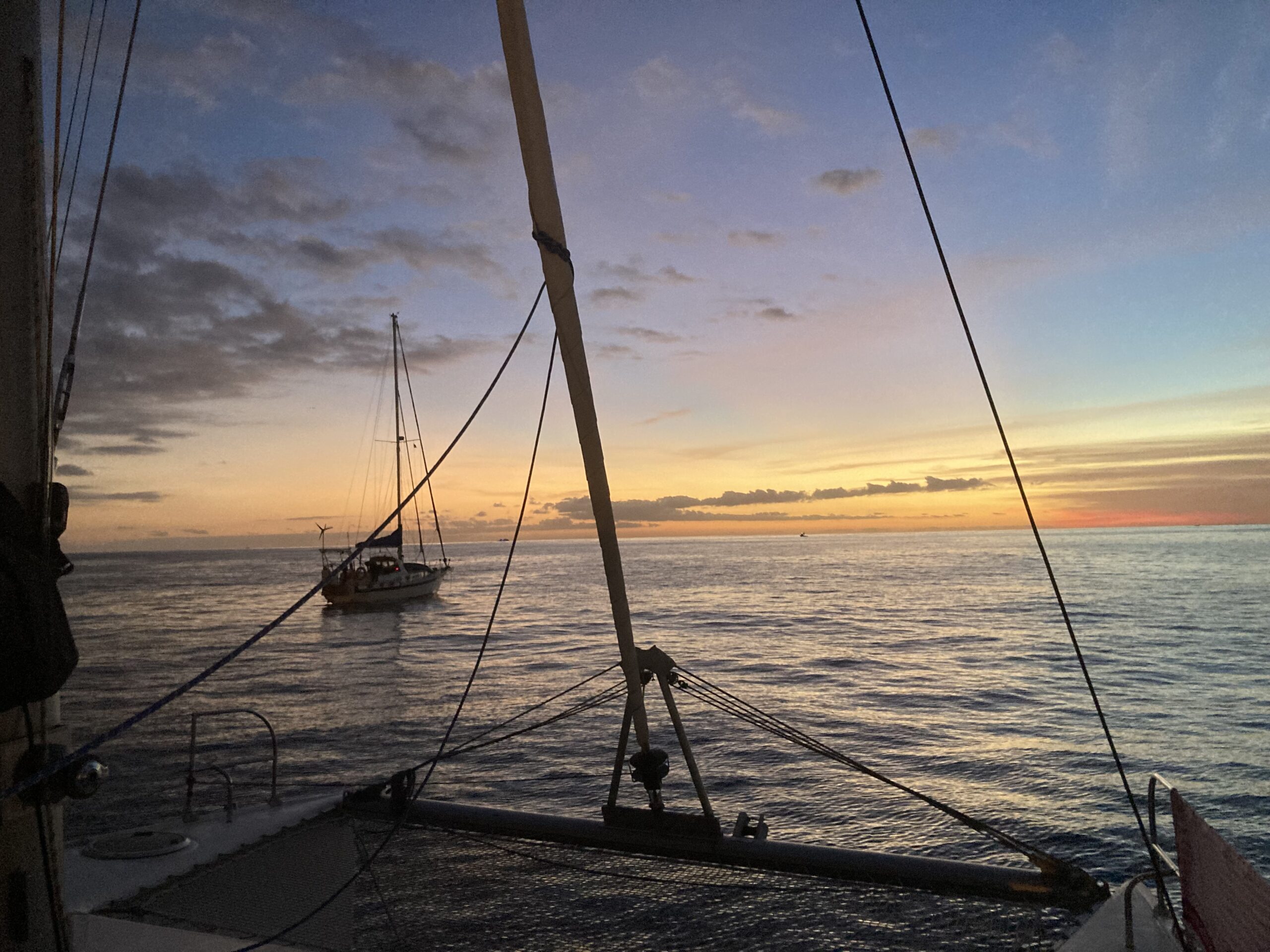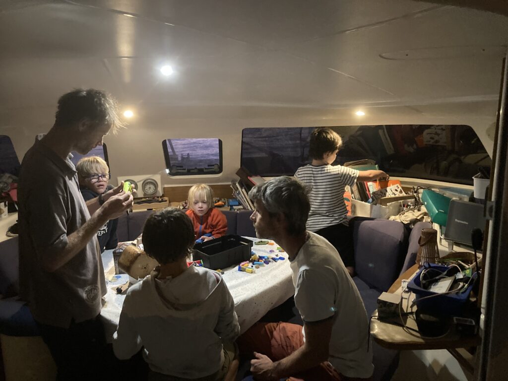 Nach einer Weile setzen wir die Segel. Auf diesem Katamaran ist das gar nicht so einfach – es braucht Kraft, Koordination und Know-How. Aber wir sind in guten Händen: Axel ist unser Kapitän für diese Überfahrt, und er war einst Weltmeister im Segeln, Elena hat schon so machen Transfer mitgemacht und ihre drei Kinder( Lucas 9, Malo 7 und Izia 4) sind nun auch schon seit August auf dem Boot unterwegs.