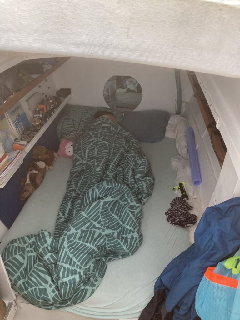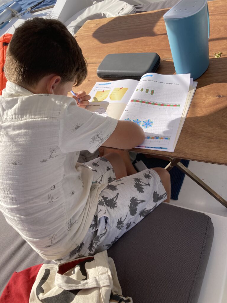 Während der Fahrt ist mal mehr, mal weniger zu tun. Die Kinder lesen, spielen, schauen nach Delfinen, übernehmen das Steuer oder helfen beim Segeltrimmen. Für sie manchmal etwas langweilig – für uns auch nicht immer hochspannend, da der Bewegungsraum begrenzt ist und es oft gemächlich vorangeht.