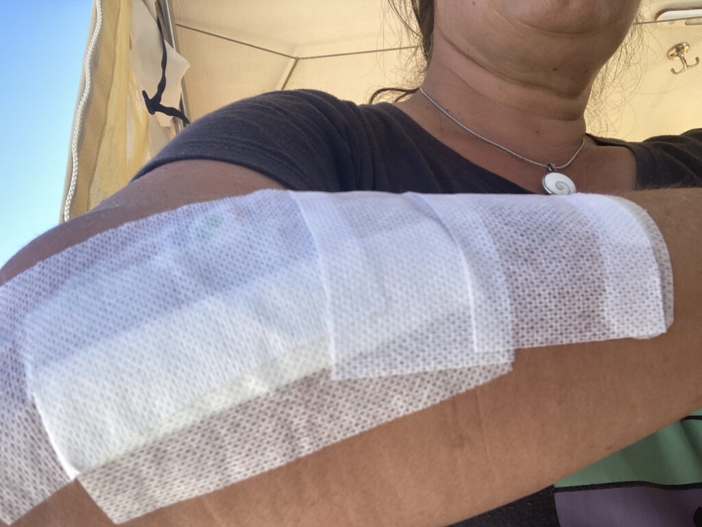 Auch im Ankern sind wir besser geworden, inzwischen sogar mit Landleine. Leider nicht ohne „Schmerzensgeld“: Beim Anbringen bin ich auf nassem, kantigem, ausgefressenem Kalk ausgerutscht und habe mir Arm, Bein, Lippen und am schlimmsten einen Schneidezahn verletzt. Ein Stück ist abgebrochen. Zum Glück war es halb so schlimm – nichts gebrochen, alles verheilt, nur der Zahn muss später noch repariert werden. Das anschliessende unfreiwillige Bad war zwar etwas „brennig“, aber harmlos.